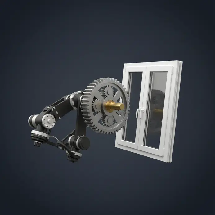 A gear assembly, robotic arm segment, and architectural window displayed as 3D CAD models.