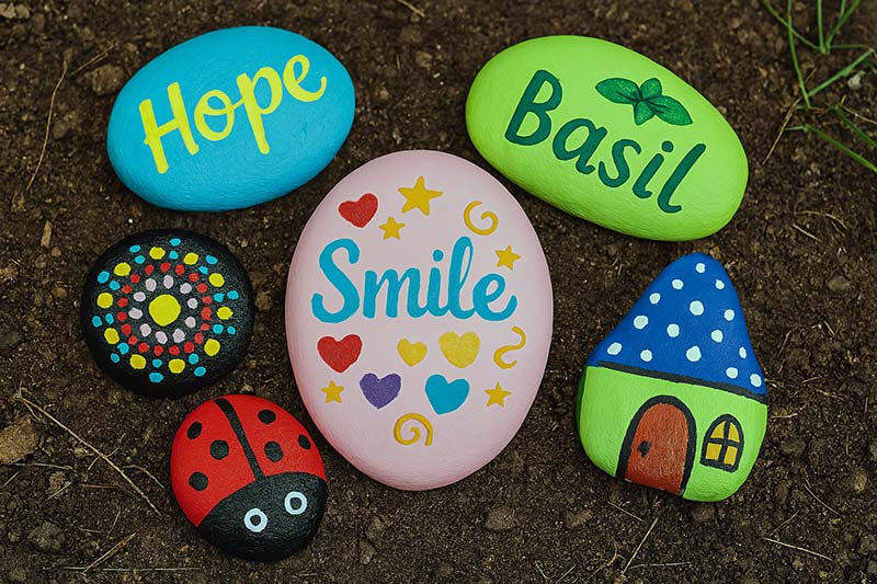 Turning the natural shape of a stone into an animal is a classic rock painting project. Round and oval stones are perfect for beetles and bugs. These are cute painted rocks that serve as excellent rock painting ideas for kids. The Ladybug: Paint the rock red. Add a black semicircle for the head. Draw a line down the back and add black dots. Add google eyes or paint white dots for eyes. The Rock Fairy: Paint a small door and window to turn it into a painted rock fairy house. These are fun to make and hide for scavenger hunts.